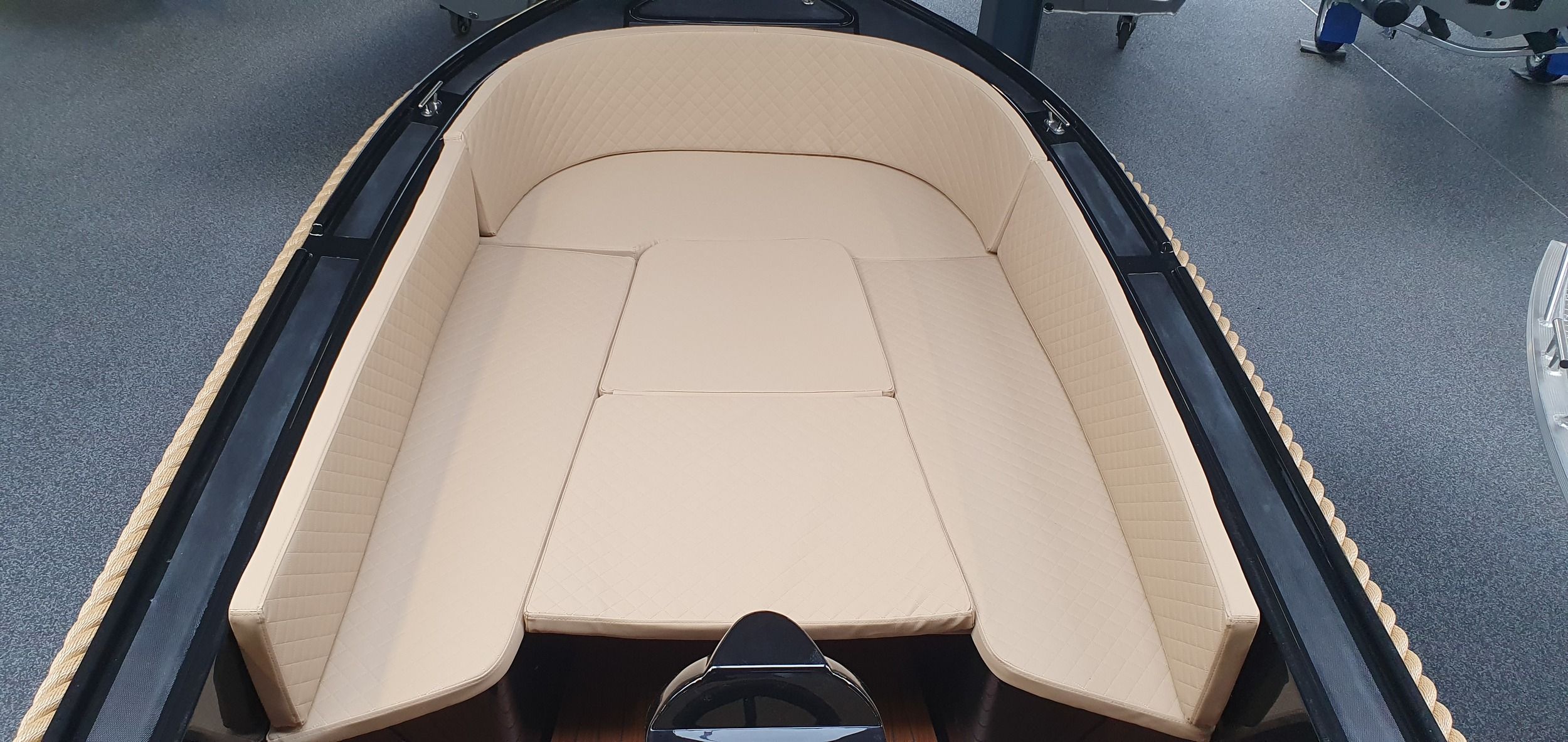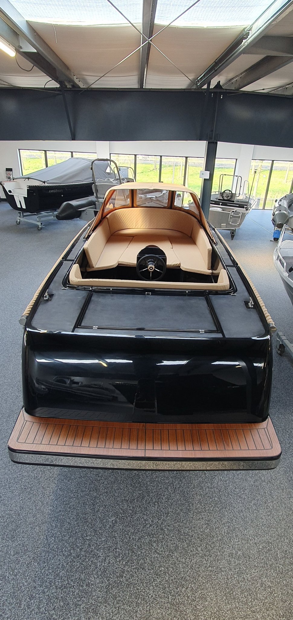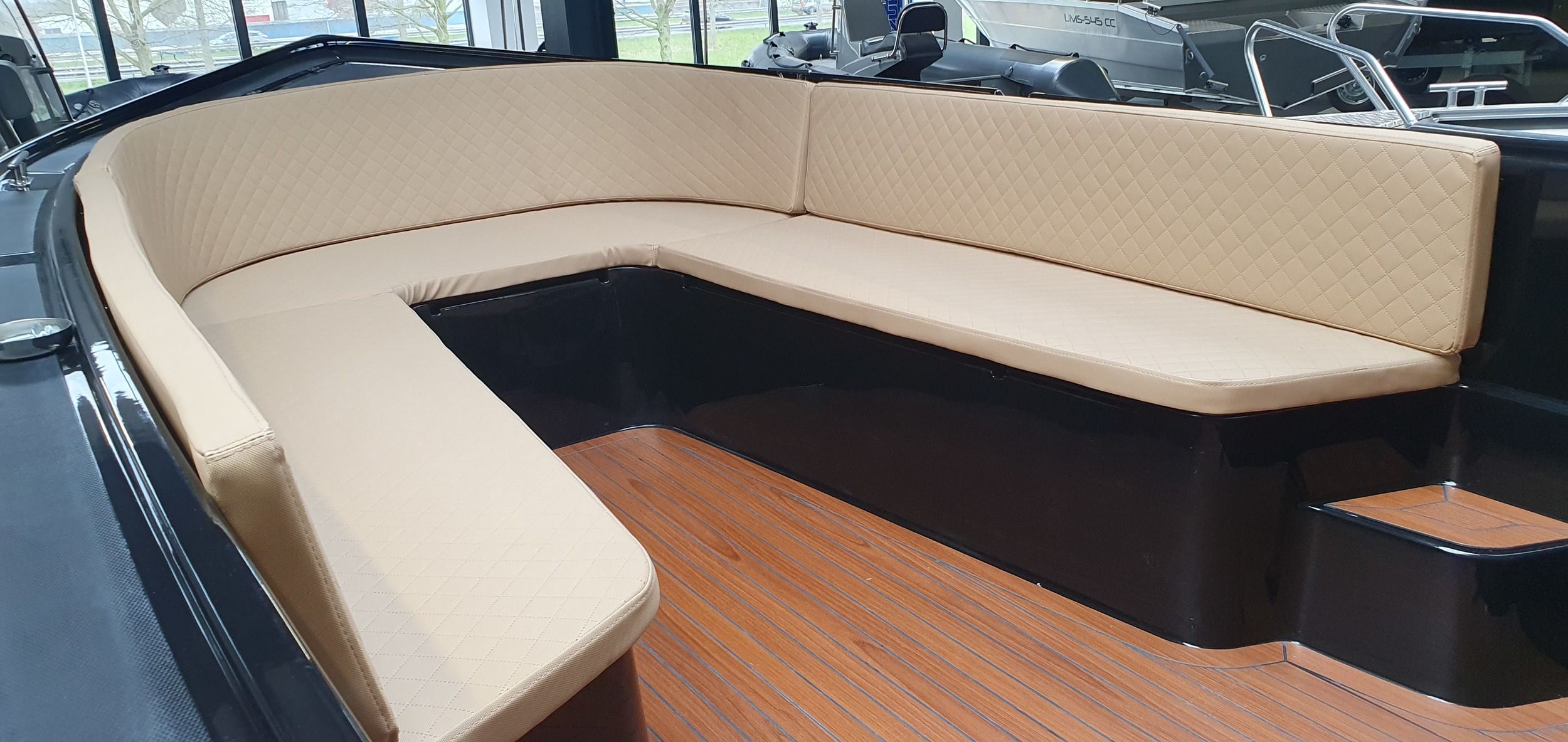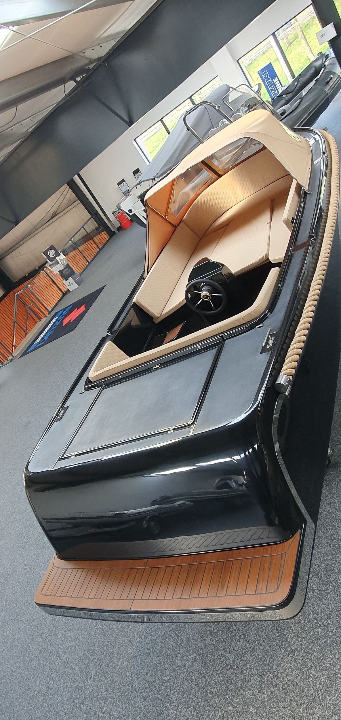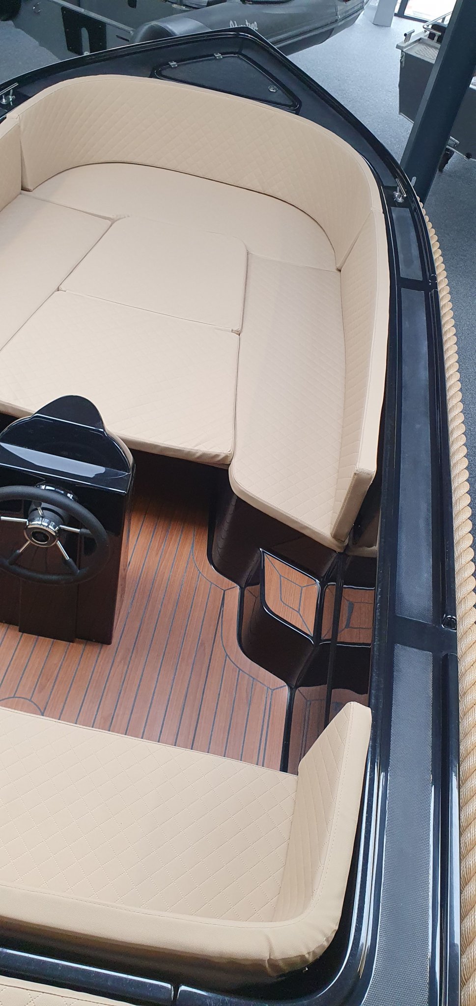 AlgemeenDe Maassloep 590 tender met BUN wordt standaard geleverd met een mooie gedetailleerde Fin Teaklook vloer en luxe kussenset. De sloep is voorzien van stijlvolle chromen